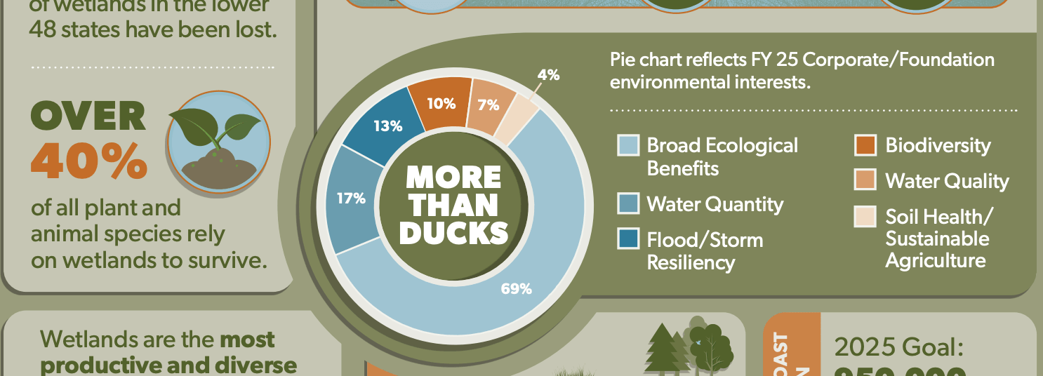 Wetlands are central to DU’s waterfowl conservation mission, but wetlands also provide many other important benefits. Wetlands are a natural defense system for drought, floods and climate change. Wetlands also aid in biodiversity, water quality and filtration, shoreline protection and recreation. As wetlands continue to disappear, so do many of the benefits they provide. Sustainability means supporting a healthy balance between the environment, people, and the economy.